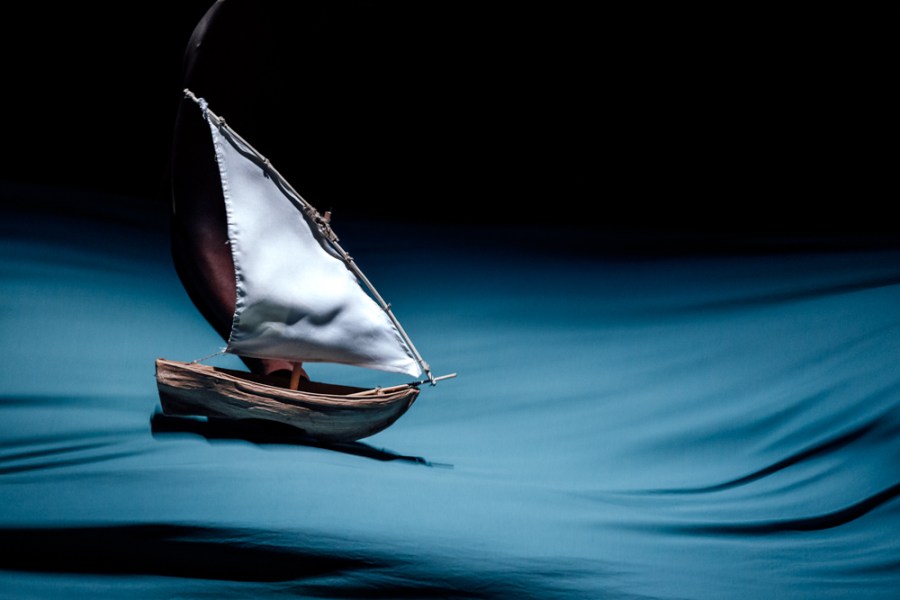 Historien kan begynde. Mændenes bevægelser på scenen er rytmiske og nøje afstemte i forhold til hinanden. Lommelygter og reb, en vandflaske, en sejlbåd, en nødradio og kæppe af bambus svæver rundt imellem dem. Havvand af bomuld. Skuespillerne nærmest danser med rekvisitterne. Bløde og stærke som bølger. De står overfor deres livs rejse og tankerne flyver gennem luften.