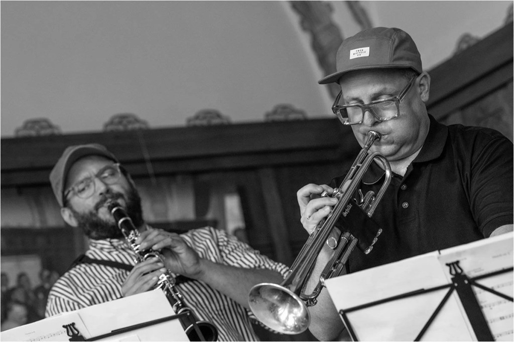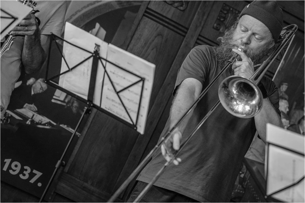Kasper Tranberg slipper trompeten et øjeblik og løfter en pegefinger. Volumen tager til mod et crescendo. Skræmmende råben.